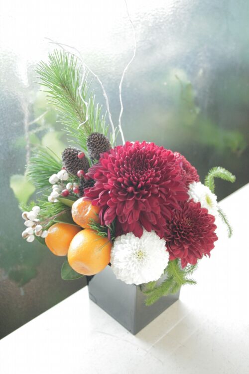 アレンジメントは宅配用のBOXにしっかりと固定するため、ラッピングは控えさせていただいております。