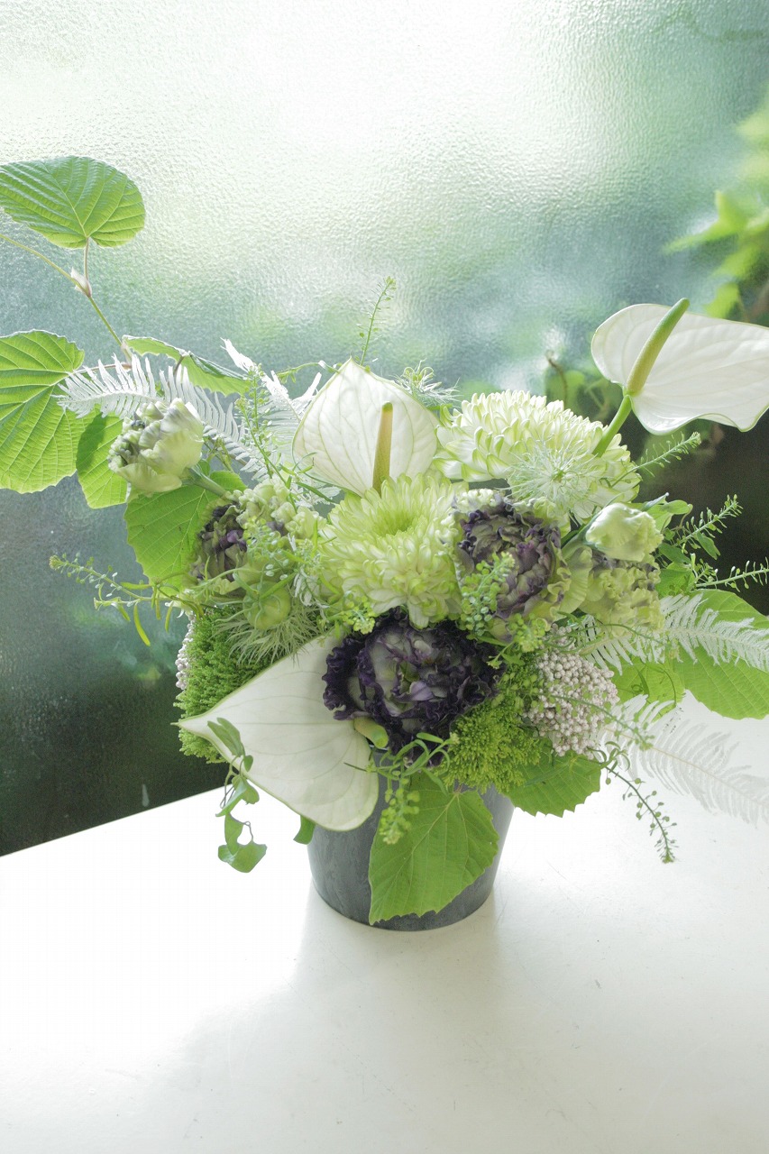 アレンジメントは宅配用のBOXにしっかりと固定するため、ラッピングは控えさせていただいております。